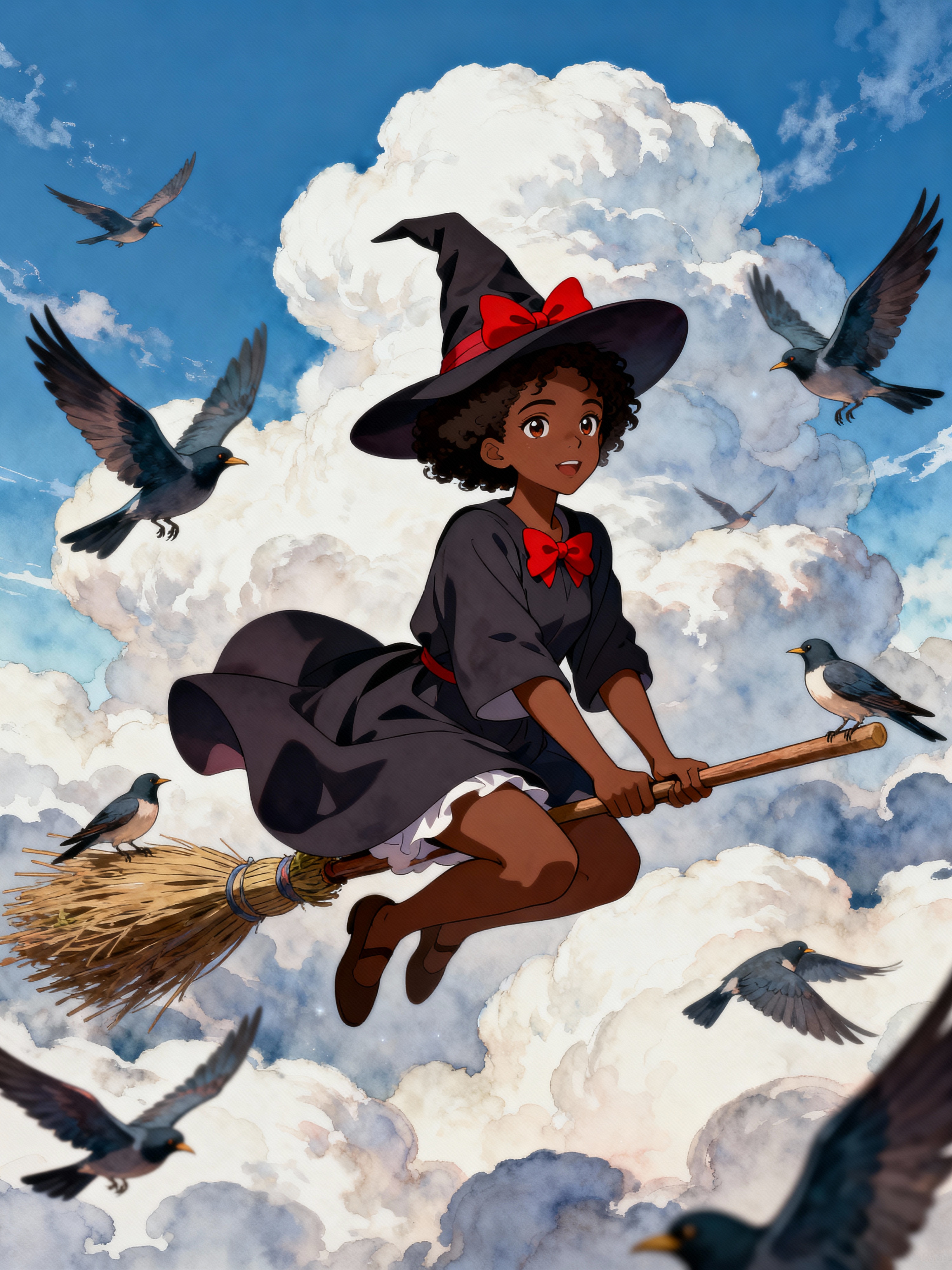 A line art anime scene of model as a character flying through clouds on a magical broomstick, wearing a witch apprentice dress with a red bow , surrounded by friendly birds. The sky is painted in soft watercolors. The style is magical.