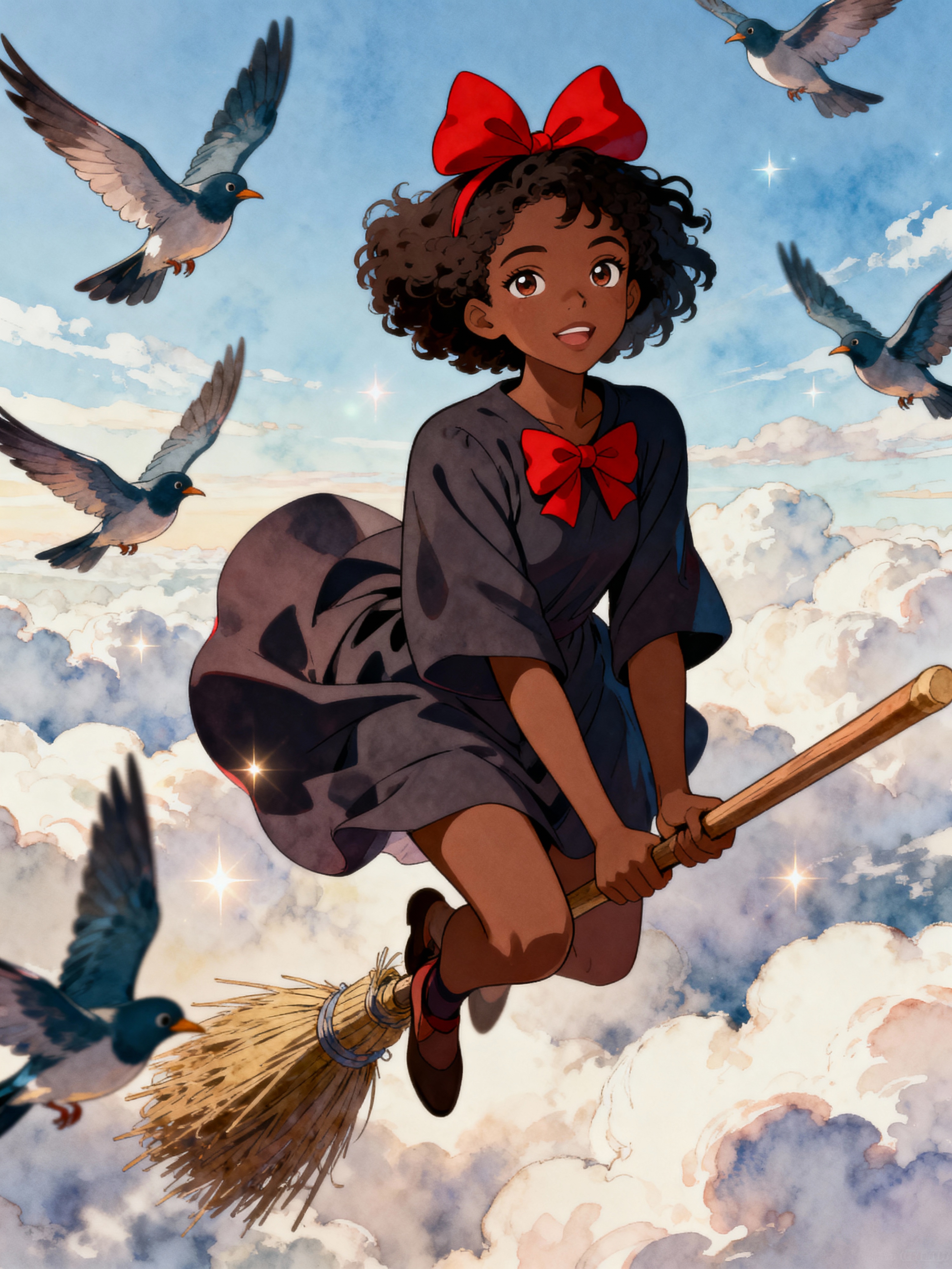 A line art anime scene of model as a character flying through clouds on a magical broomstick, wearing a witch apprentice dress with a red bow , surrounded by friendly birds. The sky is painted in soft watercolors. The style is magical.