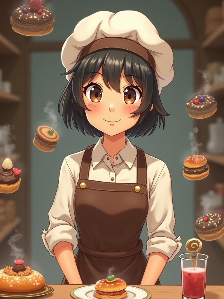 A line art anime-style anime character working in a magical bakery, wearing a baker's uniform with rolled up sleeves. The bakery is filled with floating pastries and tiny soot sprites. The style is charming and whimsical like a line art anime film.