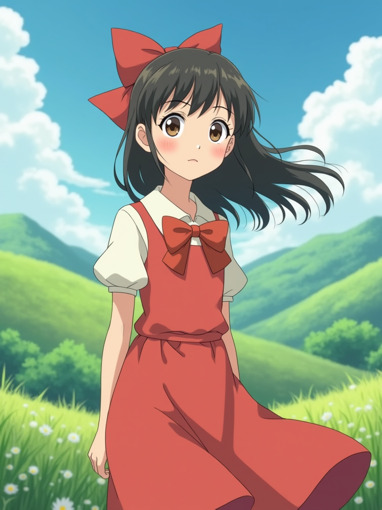 A line art anime-style anime portrait of a young adventurer, wearing a flowing dress with a red bow and gentle eyes . The background shows a peaceful countryside with rolling hills and fluffy clouds. The style is soft and whimsical like a line art anime film.