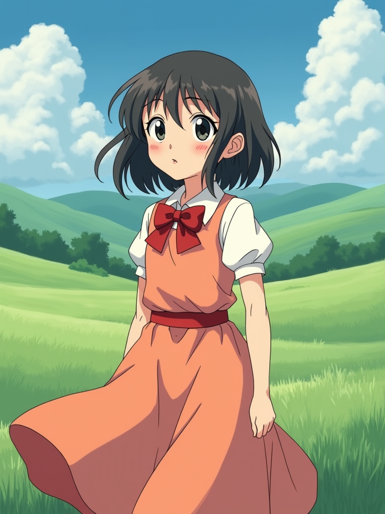 A line art anime-style anime portrait of a young adventurer, wearing a flowing dress with a red bow and gentle eyes . The background shows a peaceful countryside with rolling hills and fluffy clouds. The style is soft and whimsical like a line art anime film.