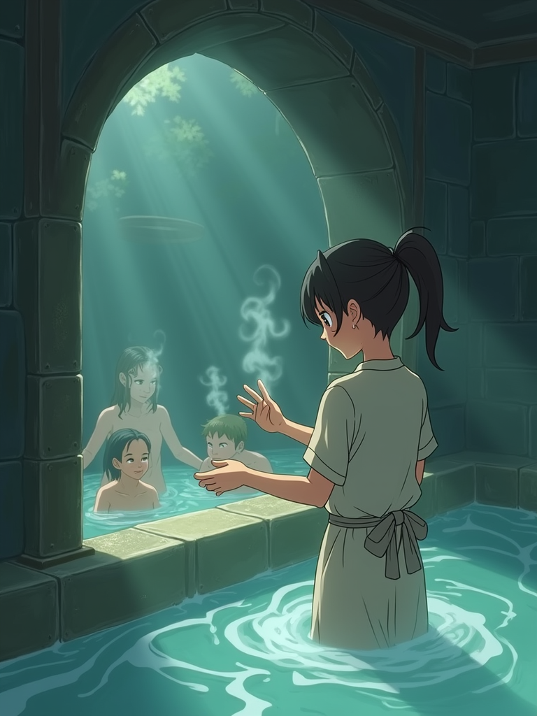 A line art anime-style anime scene at a mystical bathhouse, the character wearing simple bathhouse worker clothes, helping spirit customers. Steam and magic fill the air. The style is enchanting like a line art anime film.