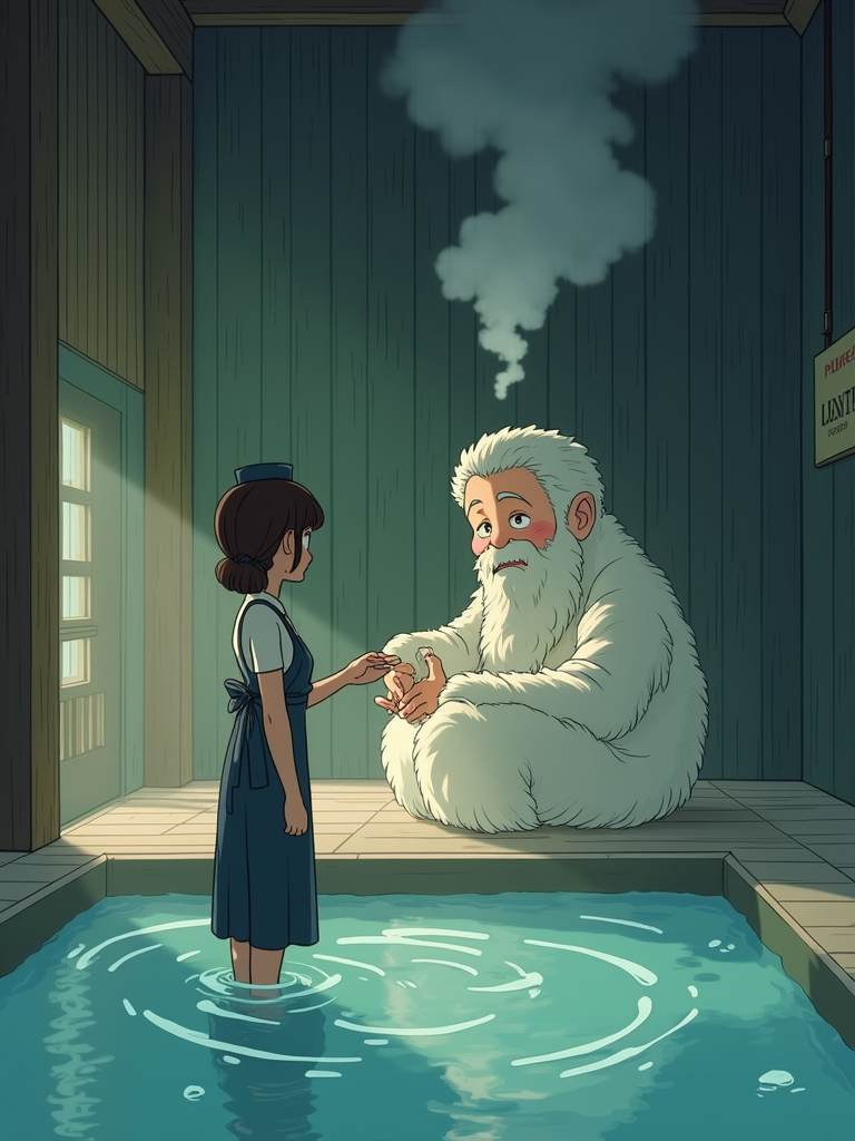 A line art anime-style anime scene at a mystical bathhouse, the character wearing simple bathhouse worker clothes, helping spirit customers. Steam and magic fill the air. The style is enchanting like a line art anime film.