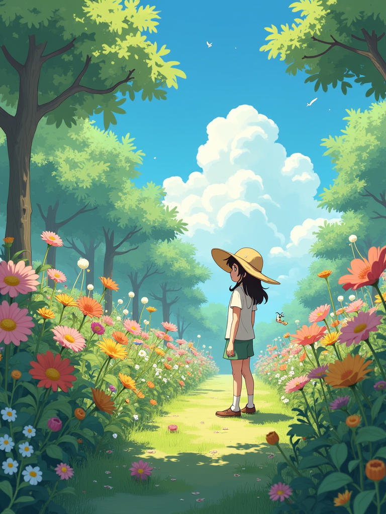 A line art anime-style anime scene in a magical garden, the character wearing light gardening clothes with a sunhat, surrounded by giant flowers and tiny garden spirits. The garden feels alive with magic. The style is peaceful like a line art anime film.
