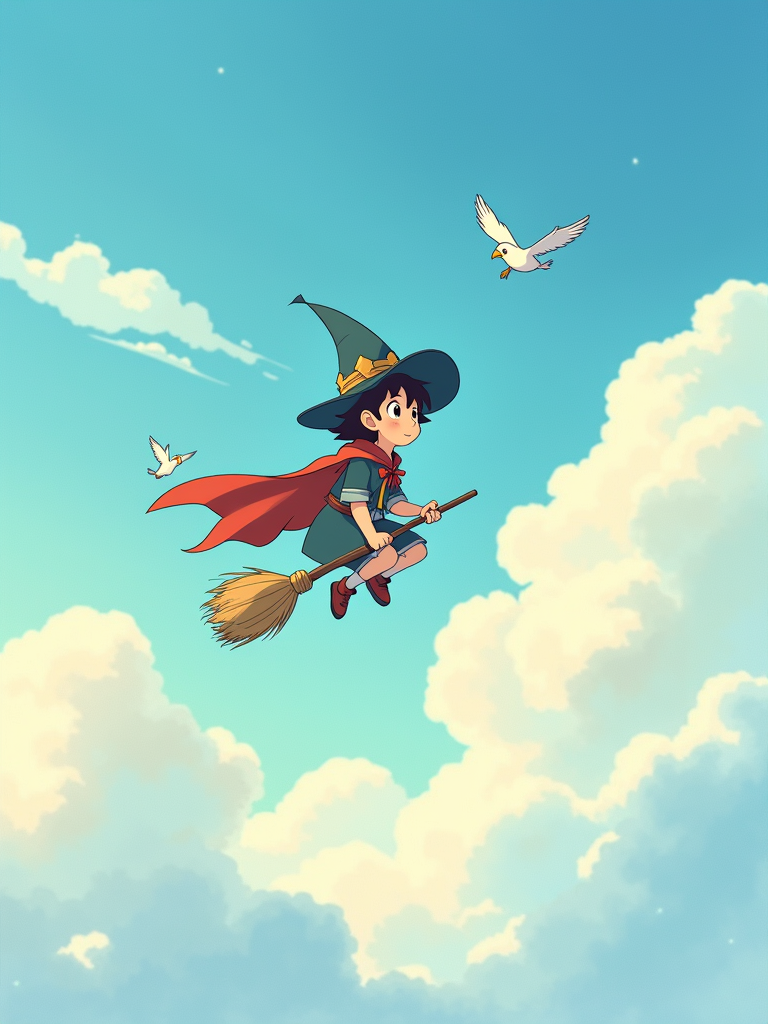 A line art anime-style anime scene of a character flying through clouds on a magical broomstick, wearing an apprentice wizard outfit with a cape, surrounded by friendly birds. The sky is painted in soft watercolors. The style is magical like a line art anime film.