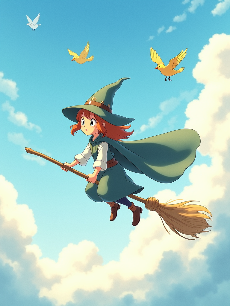 A line art anime-style anime scene of a character flying through clouds on a magical broomstick, wearing an apprentice wizard outfit with a cape, surrounded by friendly birds. The sky is painted in soft watercolors. The style is magical like a line art anime film.