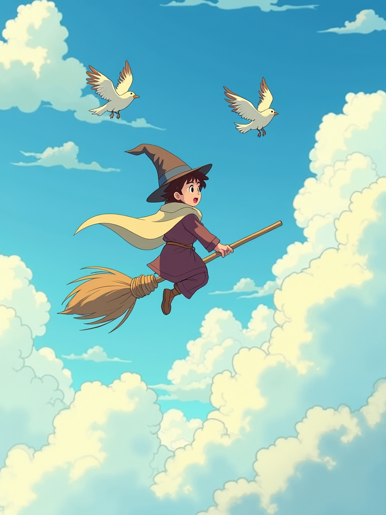 A line art anime-style anime scene of a character flying through clouds on a magical broomstick, wearing an apprentice wizard outfit with a cape, surrounded by friendly birds. The sky is painted in soft watercolors. The style is magical like a line art anime film.