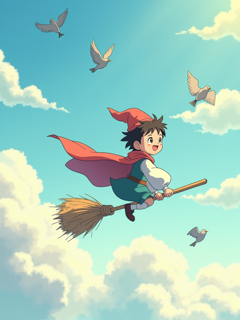 A line art anime-style anime scene of a character flying through clouds on a magical broomstick, wearing an apprentice wizard outfit with a cape, surrounded by friendly birds. The sky is painted in soft watercolors. The style is magical like a line art anime film.