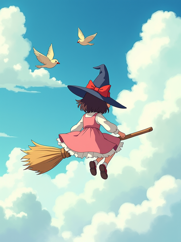 A line art anime-style anime scene of a character flying through clouds on a magical broomstick, wearing a witch apprentice dress with a red bow , surrounded by friendly birds. The sky is painted in soft watercolors. The style is magical like a line art anime film.