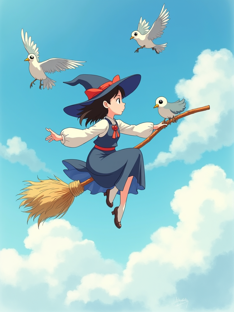 A line art anime-style anime scene of a character flying through clouds on a magical broomstick, wearing a witch apprentice dress with a red bow , surrounded by friendly birds. The sky is painted in soft watercolors. The style is magical like a line art anime film.