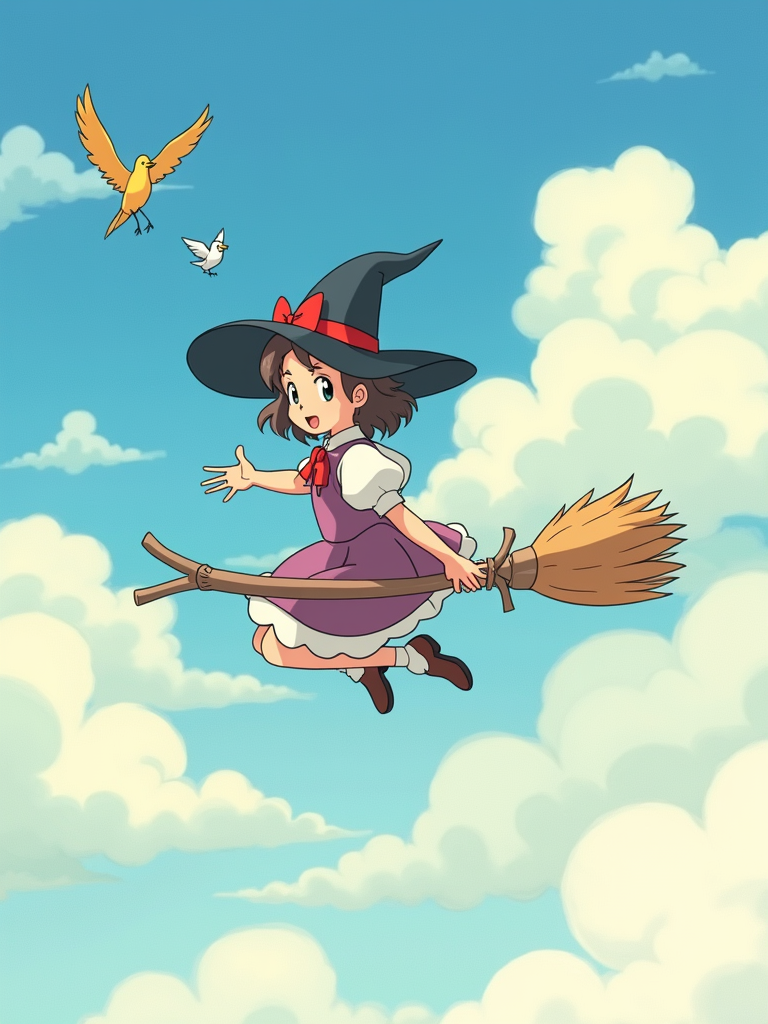 A line art anime-style anime scene of a character flying through clouds on a magical broomstick, wearing a witch apprentice dress with a red bow , surrounded by friendly birds. The sky is painted in soft watercolors. The style is magical like a line art anime film.