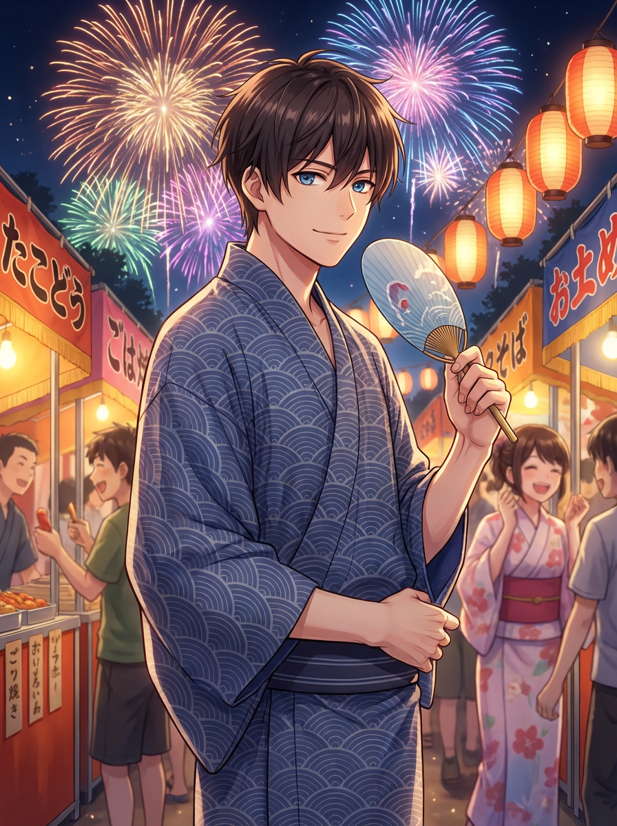 A lively anime summer festival with fireworks illuminating the night sky. The character wears a casual yukata with rolled-up sleeves and a paper fan. Lanterns glow softly in the background, with festival stands and excited people enjoying the night. The style is in anime illustration.