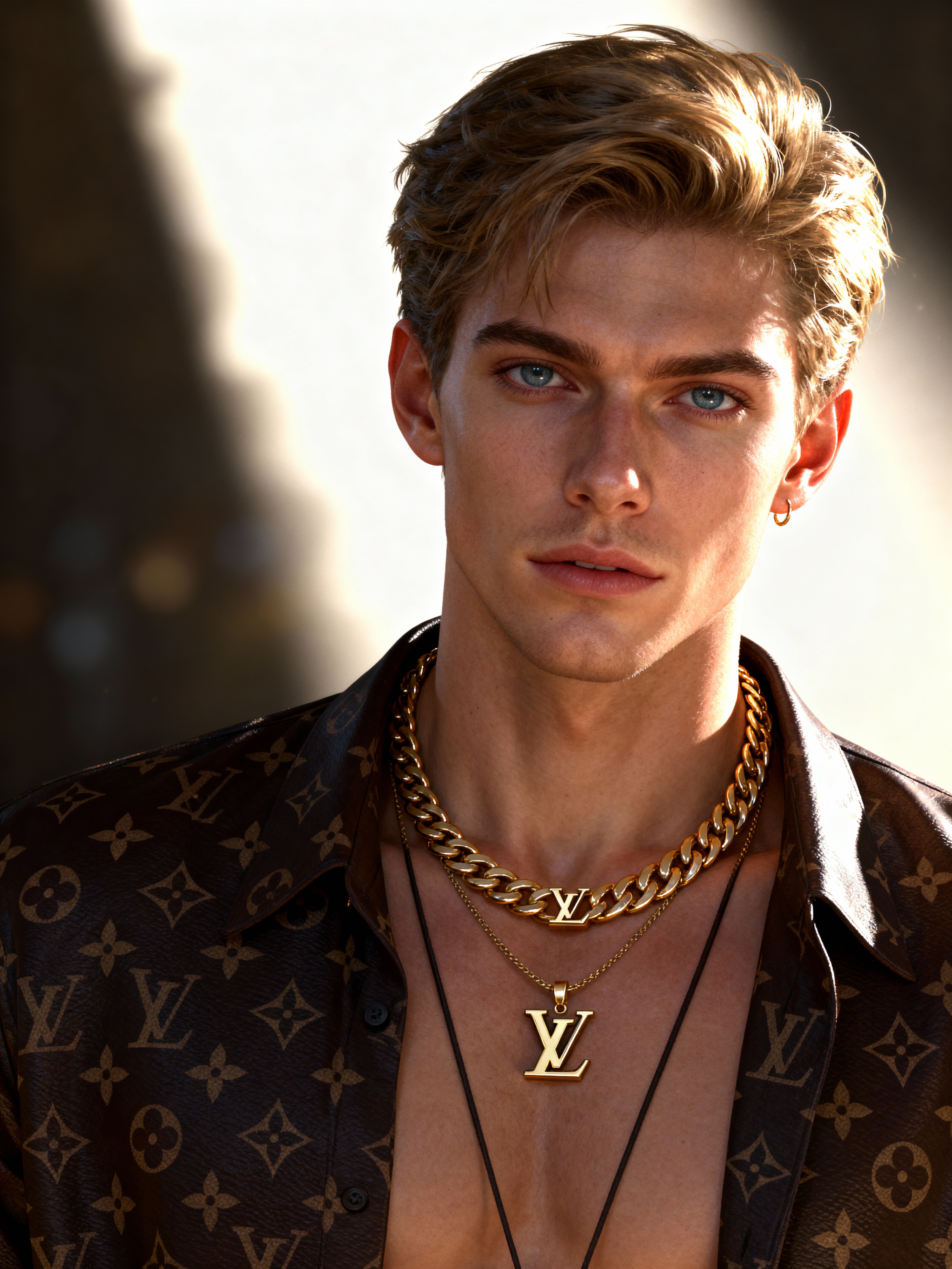 a male model as a beautiful fashion charming dreamlike model with lv jewelry, character art, art by artgerm lau and wlop and and ilya kuvshinov and john singer sargent, hyperdetailed, 8 k realistic, symmetrical, frostbite 3 engine, cryengine, dof, trending on artstation, digital art