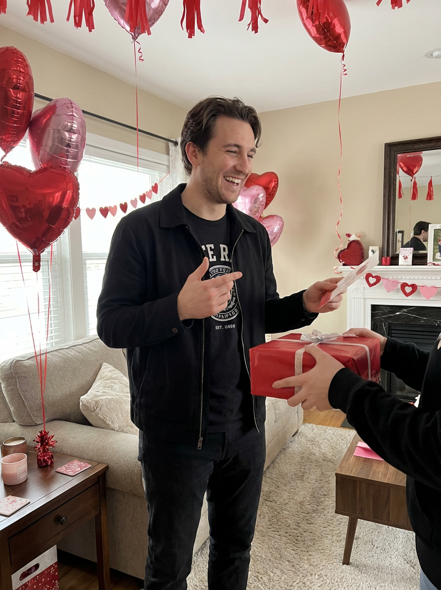 A model celebrating Valentine's Day, exchanging gifts and having fun in a cozy, heart-filled setting.