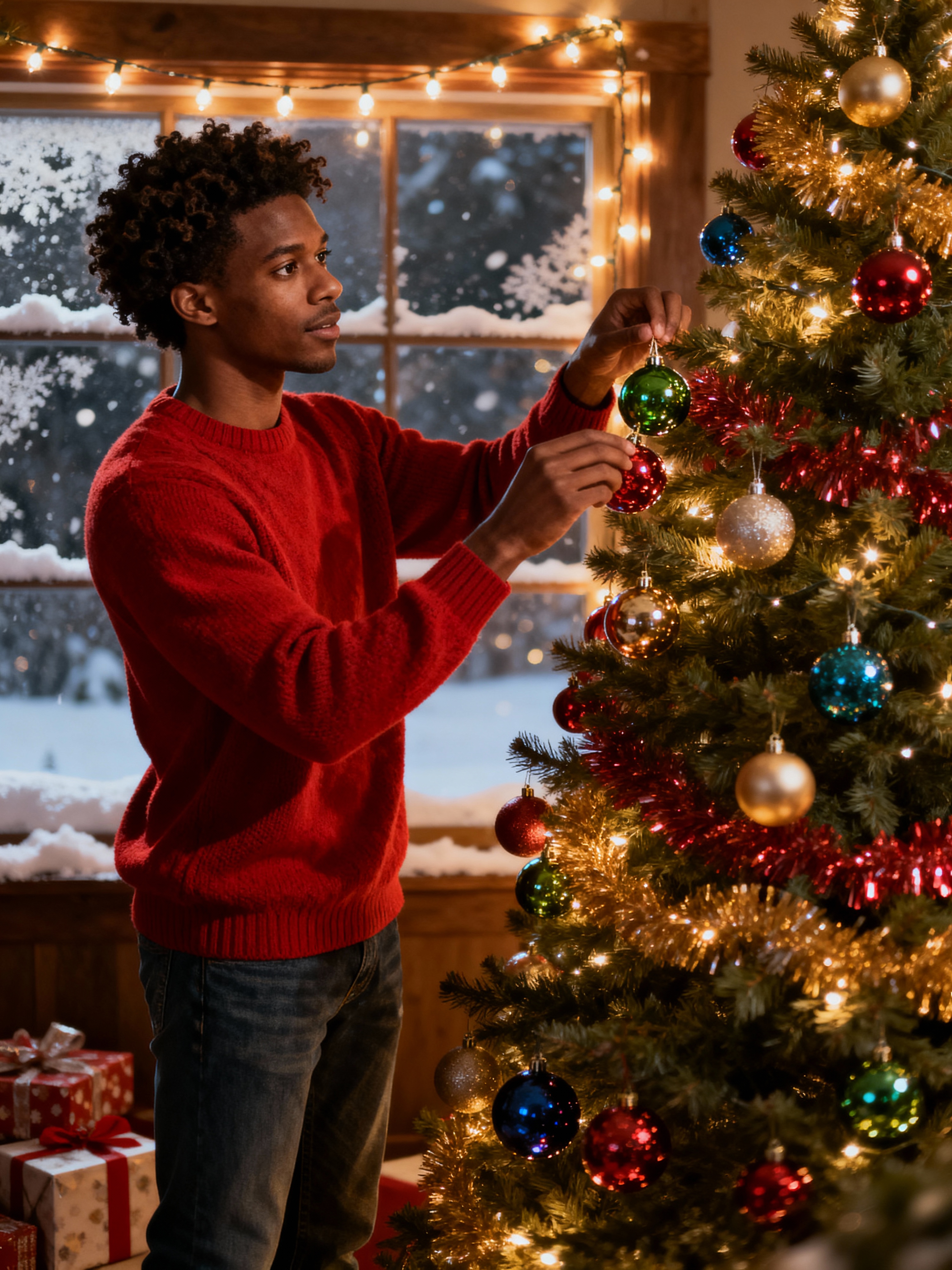 A model decorating a Christmas tree with colorful ornaments and tinsel, in a warm, festive setting.