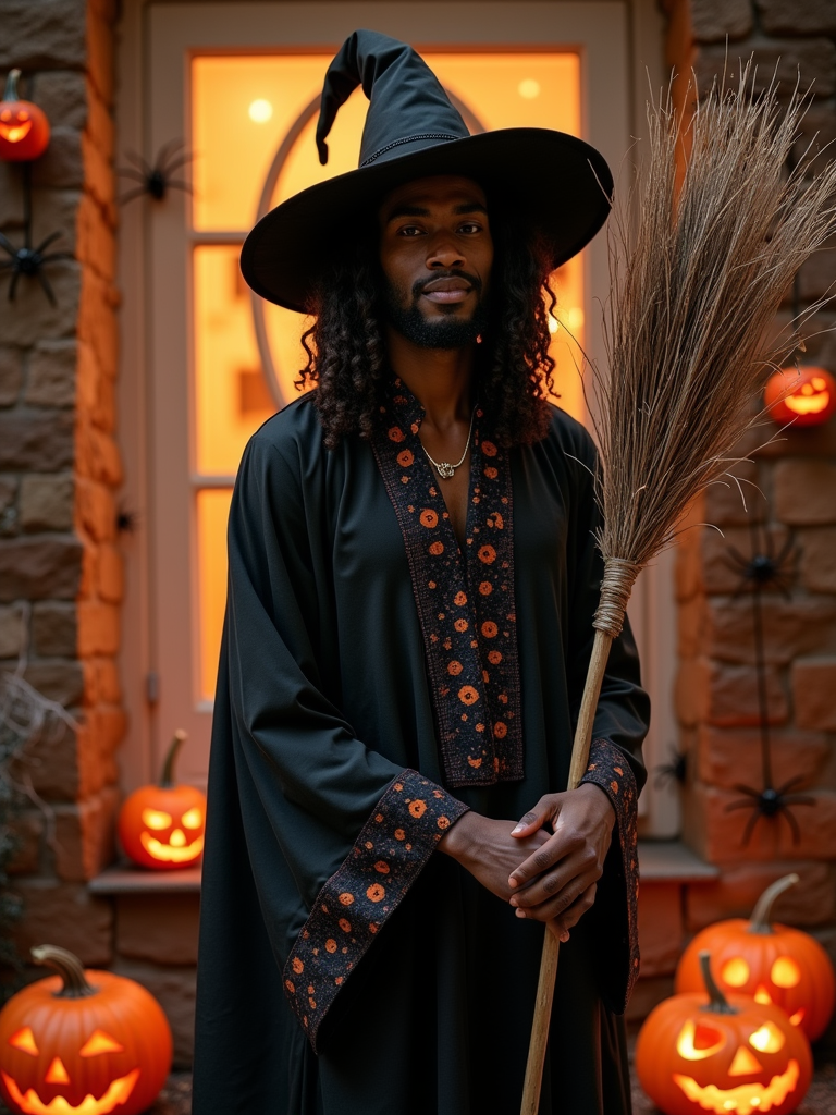 A model dressed as a friendly witch, wearing a pointed hat and holding a broomstick, surrounded by Halloween decorations like spider webs and glowing pumpkins.