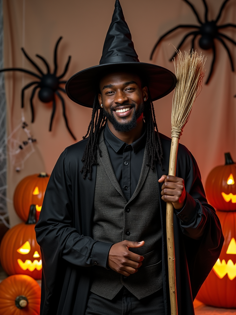 A model dressed as a friendly witch, wearing a pointed hat and holding a broomstick, surrounded by Halloween decorations like spider webs and glowing pumpkins.
