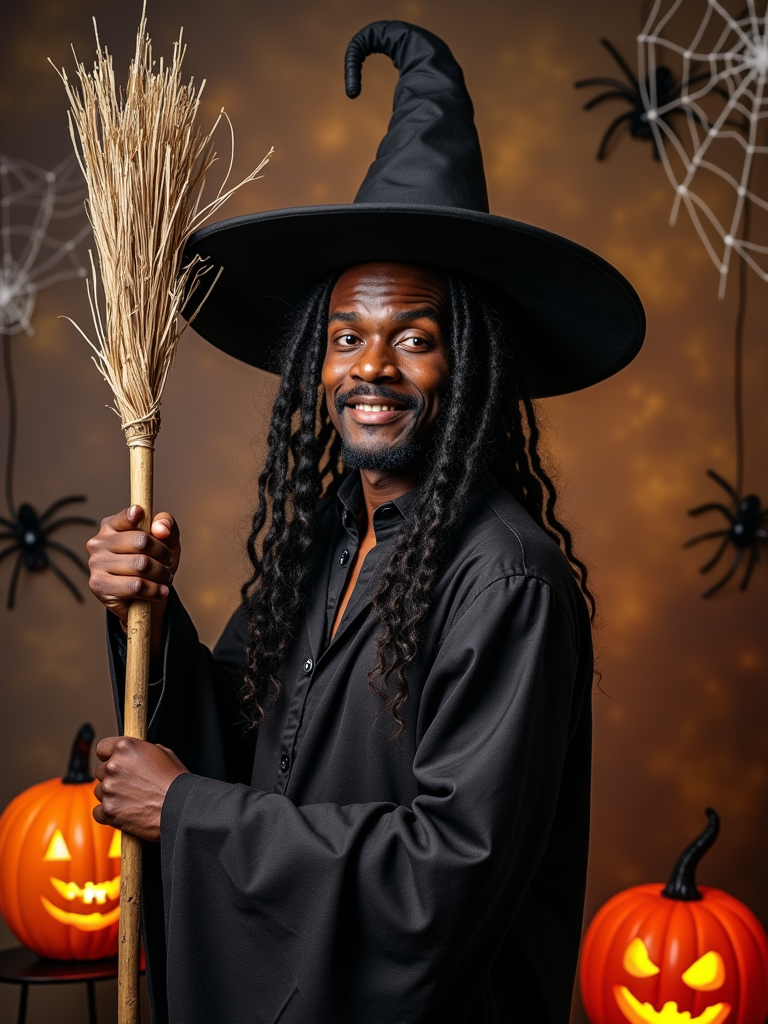 A model dressed as a friendly witch, wearing a pointed hat and holding a broomstick, surrounded by Halloween decorations like spider webs and glowing pumpkins.