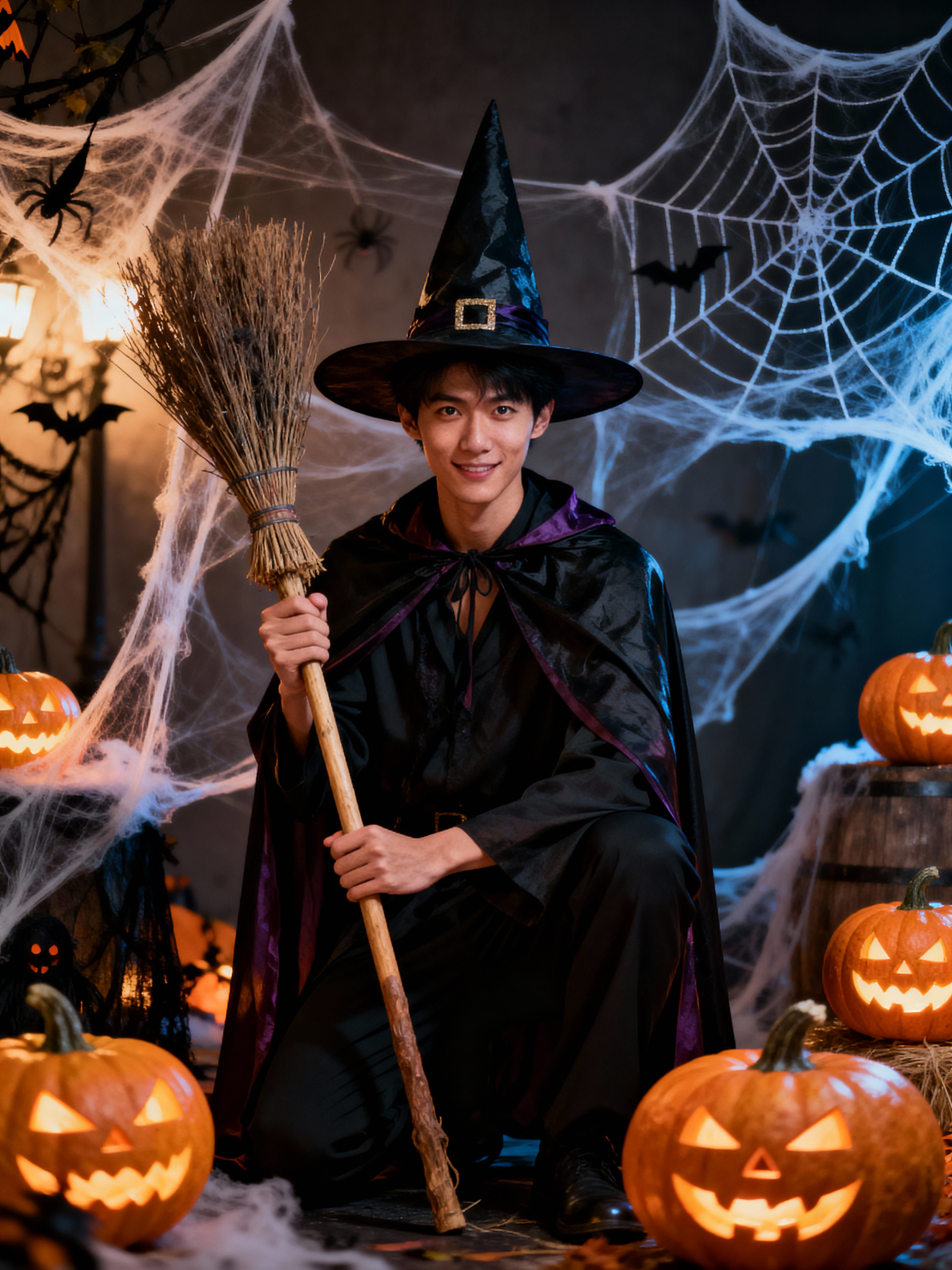 A model dressed as a friendly witch, wearing a pointed hat and holding a broomstick, surrounded by Halloween decorations like spider webs and glowing pumpkins.