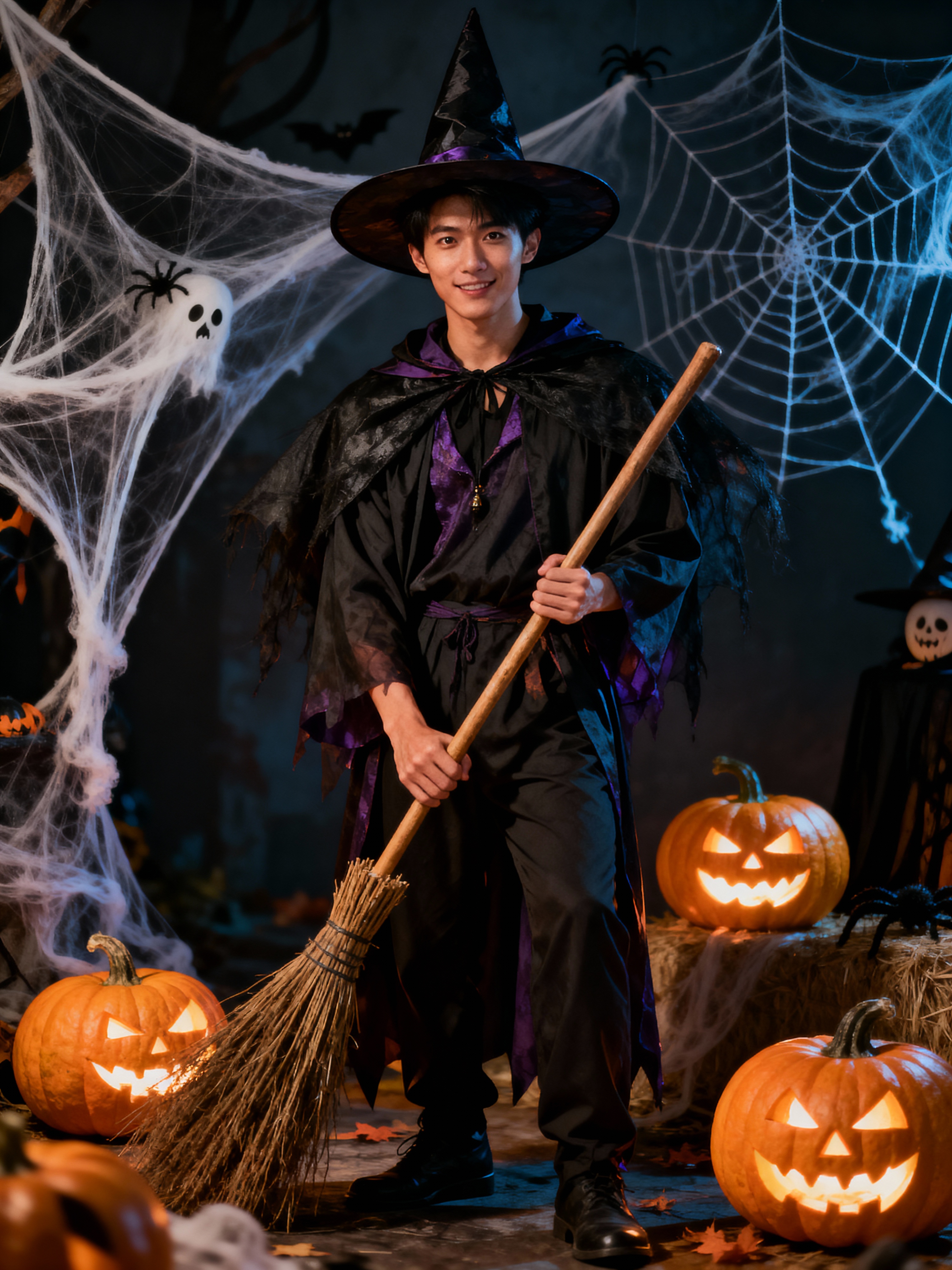 A model dressed as a friendly witch, wearing a pointed hat and holding a broomstick, surrounded by Halloween decorations like spider webs and glowing pumpkins.