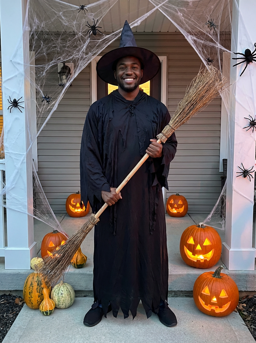 A model dressed as a friendly witch, wearing a pointed hat and holding a broomstick, surrounded by Halloween decorations like spider webs and glowing pumpkins.