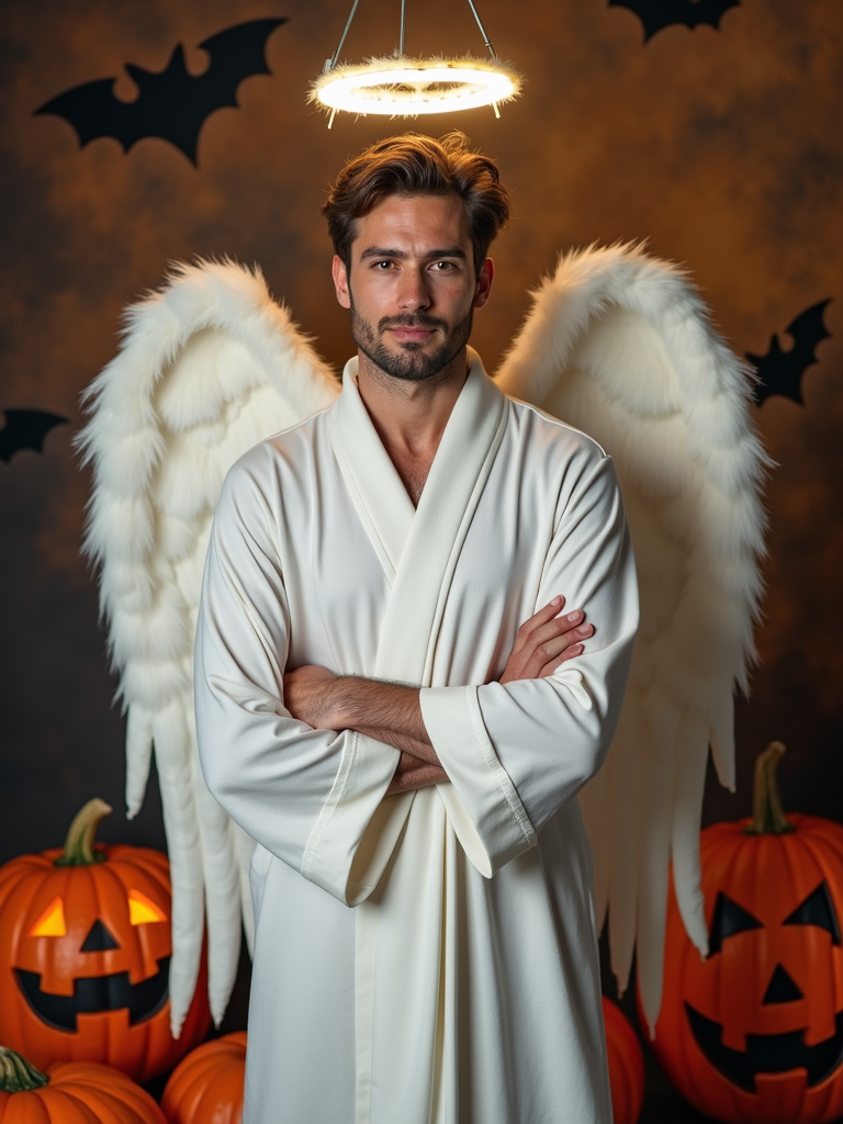 A model dressed as an angel, wearing a white robe with wings and a halo, posing against a Halloween backdrop with carved pumpkins and bats.