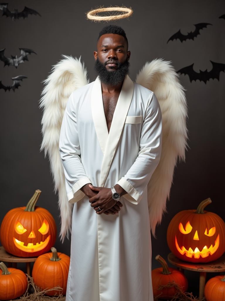 A model dressed as an angel, wearing a white robe with wings and a halo, posing against a Halloween backdrop with carved pumpkins and bats.