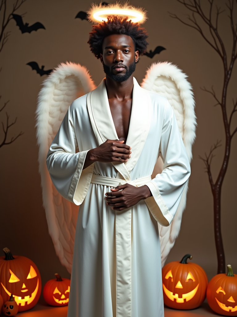 A model dressed as an angel, wearing a white robe with wings and a halo, posing against a Halloween backdrop with carved pumpkins and bats.