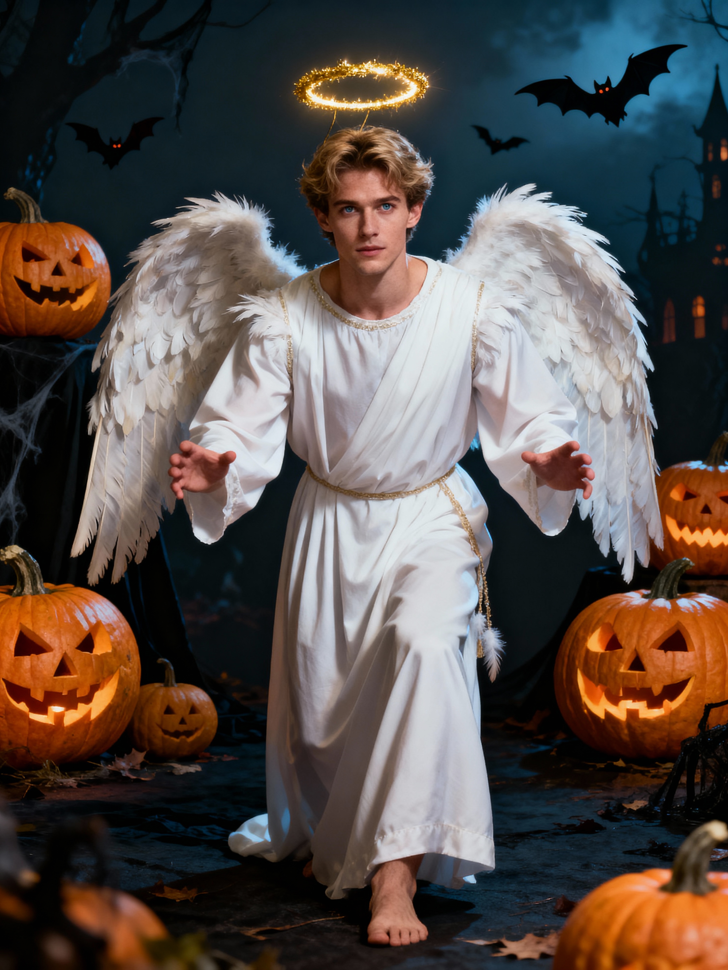 A model dressed as an angel, wearing a white robe with wings and a halo, posing against a Halloween backdrop with carved pumpkins and bats.
