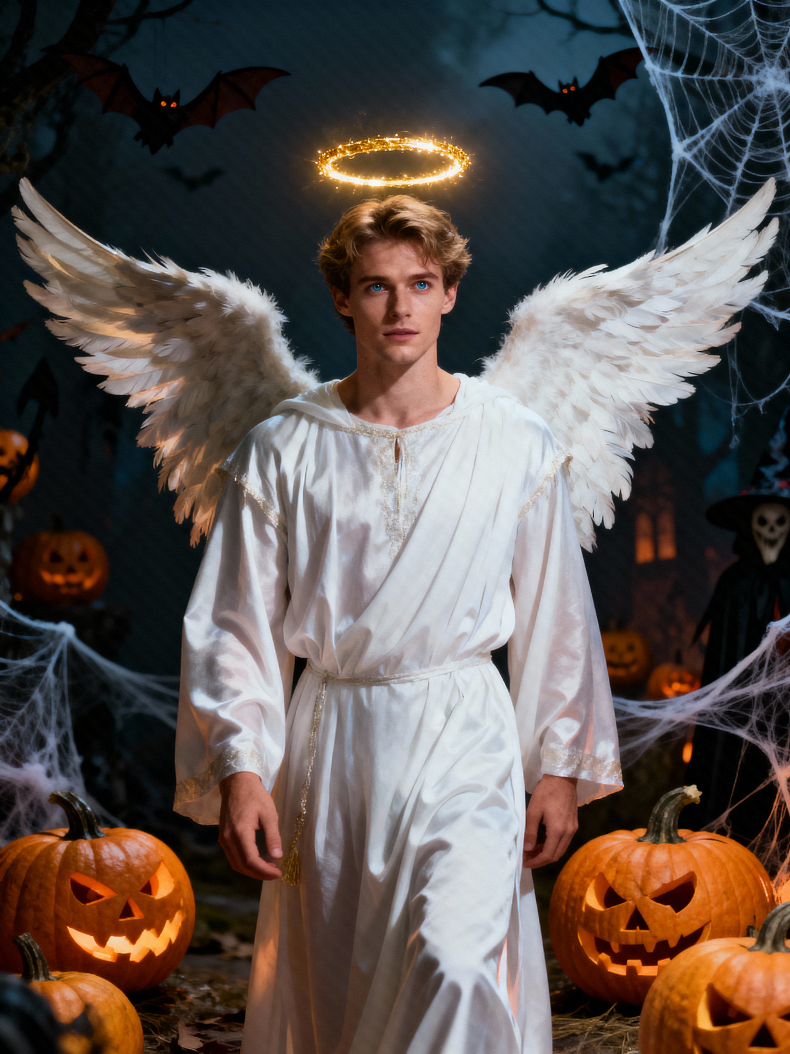 A model dressed as an angel, wearing a white robe with wings and a halo, posing against a Halloween backdrop with carved pumpkins and bats.