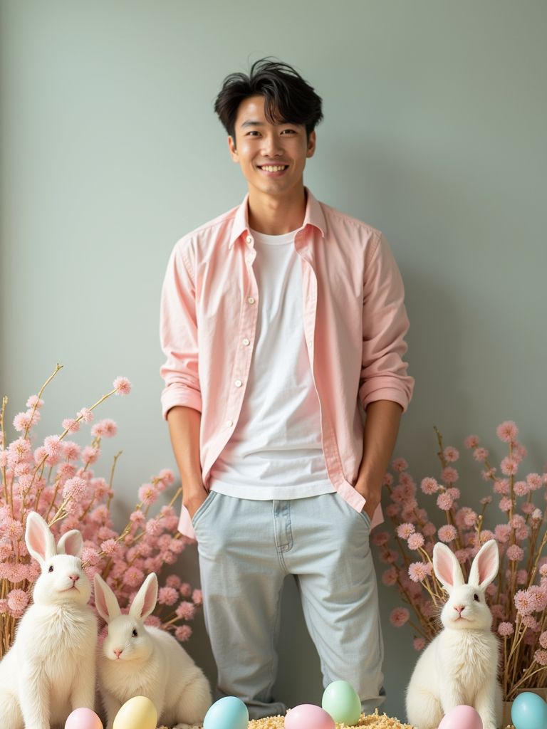 A model dressed in a casual spring outfit, surrounded by pastel Easter decorations like eggs, flowers, and bunnies.