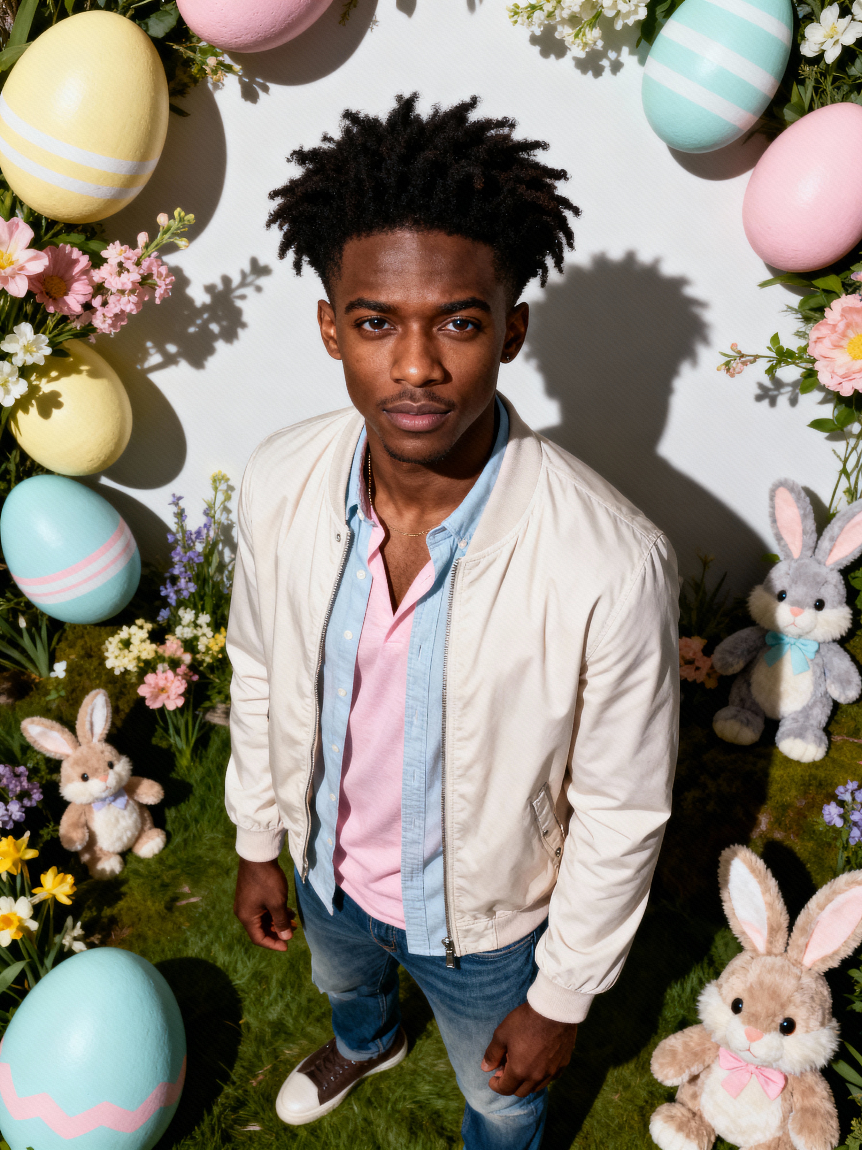 A model dressed in a casual spring outfit, surrounded by pastel Easter decorations like eggs, flowers, and bunnies.