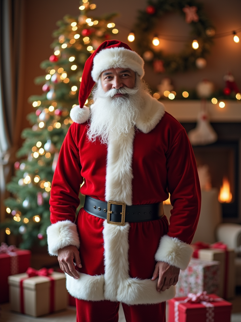 A model dressed in a classic Santa costume, standing in a room filled with holiday decorations, presents, and a Christmas tree.