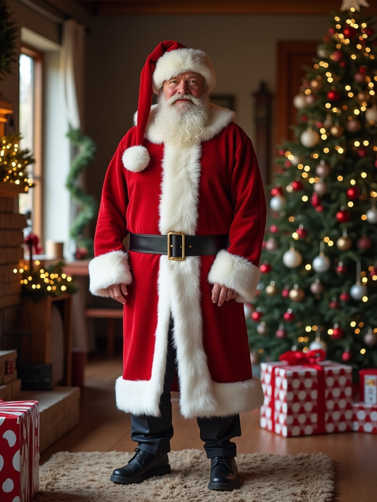 A model dressed in a classic Santa costume, standing in a room filled with holiday decorations, presents, and a Christmas tree.