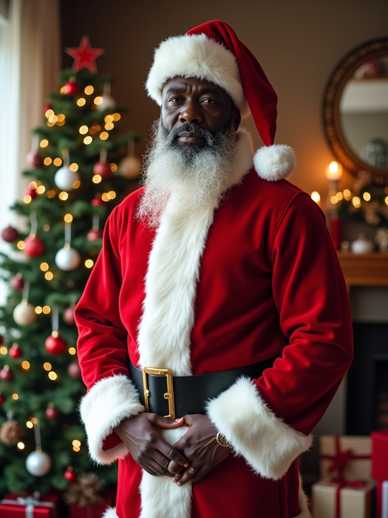 A model dressed in a classic Santa costume, standing in a room filled with holiday decorations, presents, and a Christmas tree.