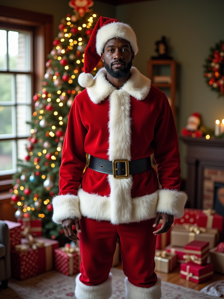 A model dressed in a classic Santa costume, standing in a room filled with holiday decorations, presents, and a Christmas tree.