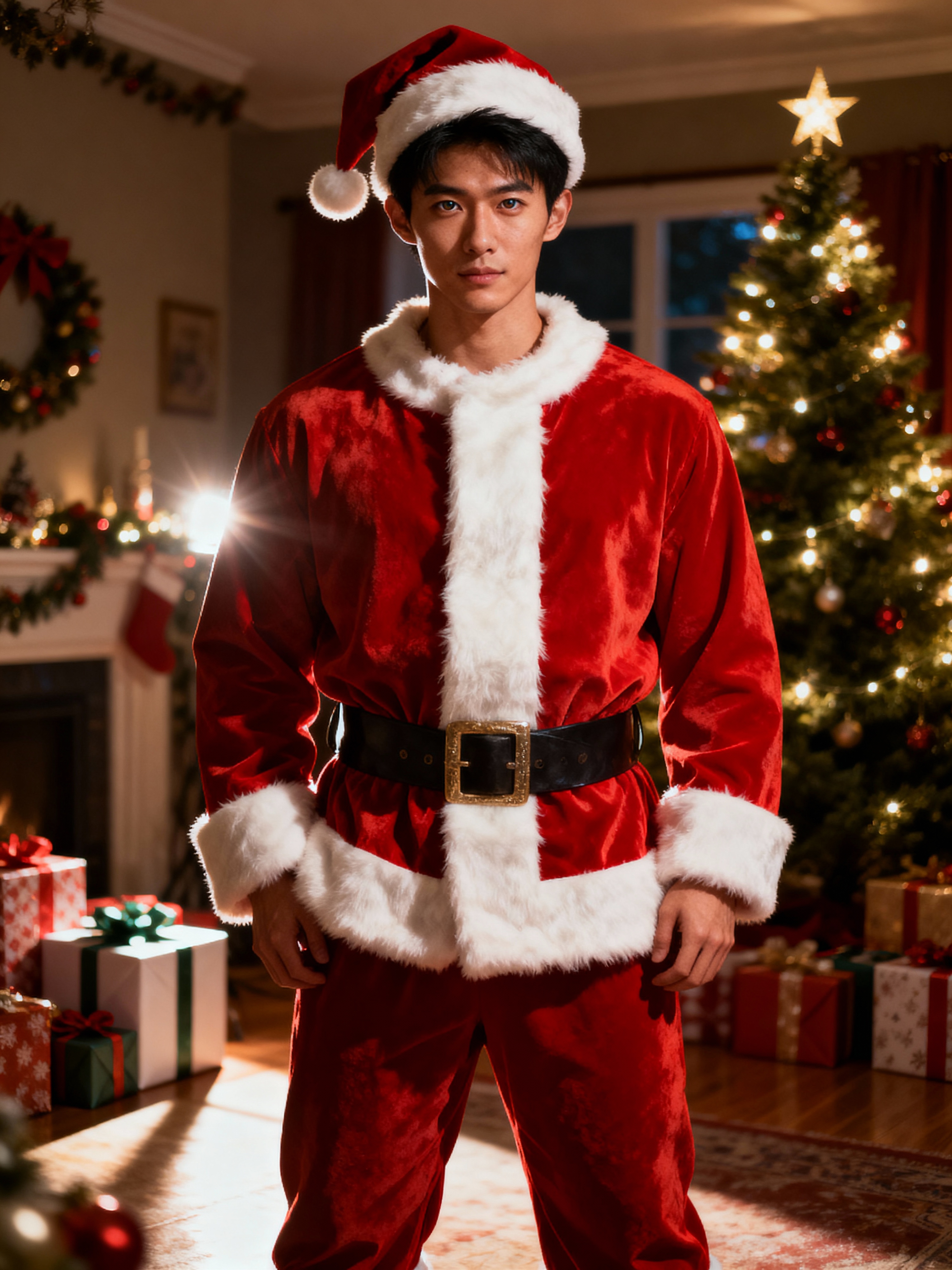 A model dressed in a classic Santa costume, standing in a room filled with holiday decorations, presents, and a Christmas tree.