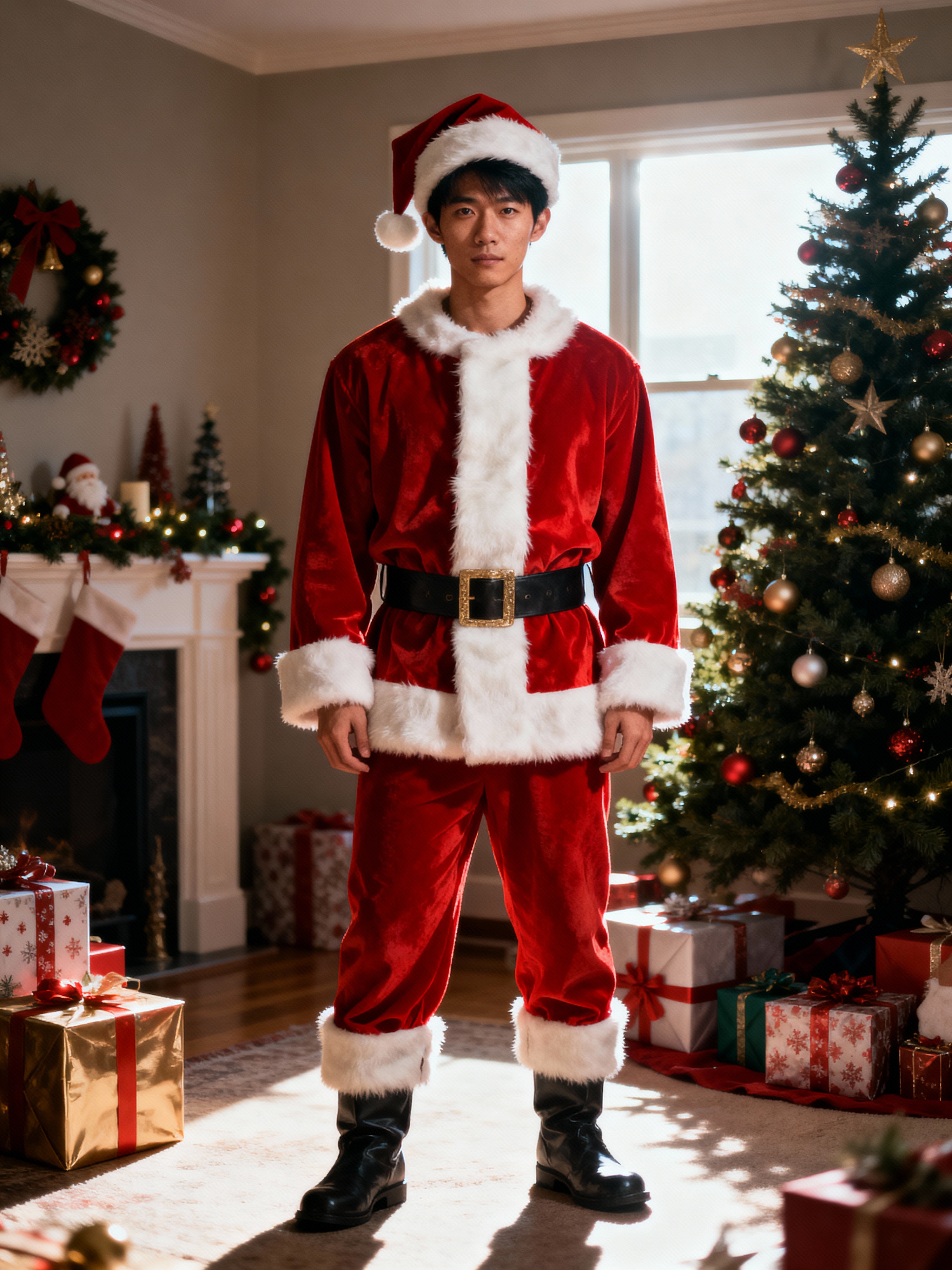A model dressed in a classic Santa costume, standing in a room filled with holiday decorations, presents, and a Christmas tree.