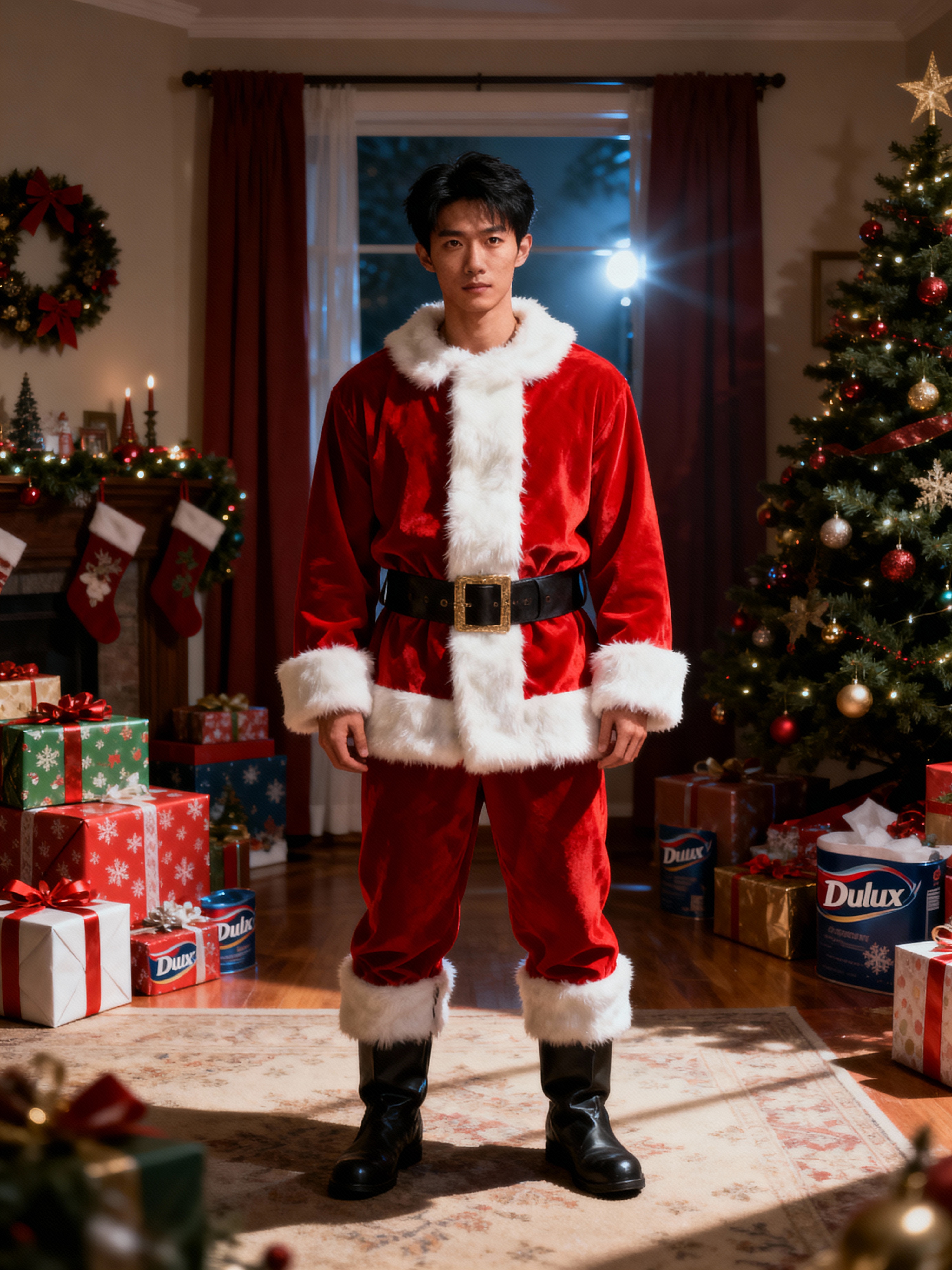 A model dressed in a classic Santa costume, standing in a room filled with holiday decorations, presents, and a Christmas tree.