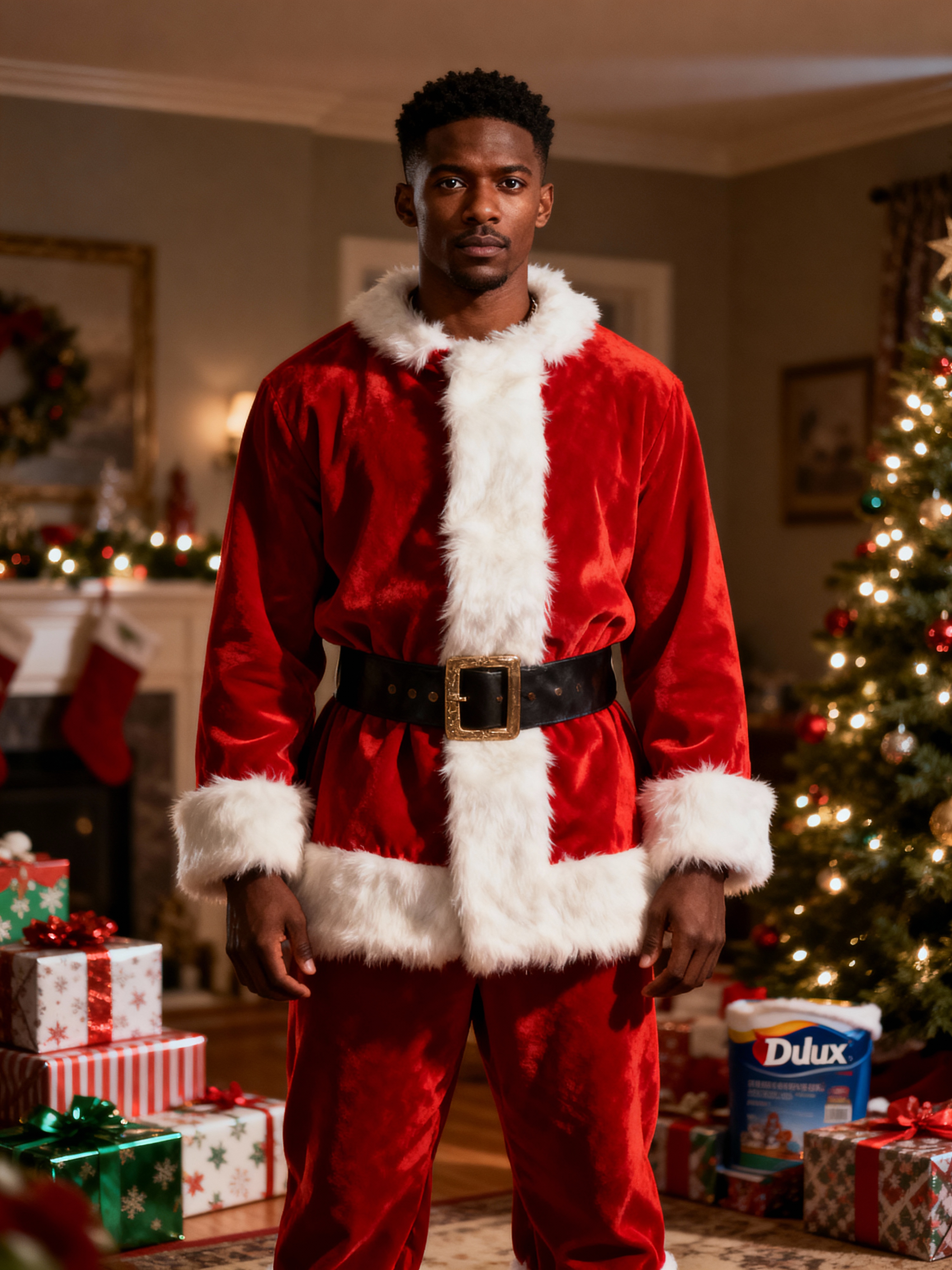 A model dressed in a classic Santa costume, standing in a room filled with holiday decorations, presents, and a Christmas tree.