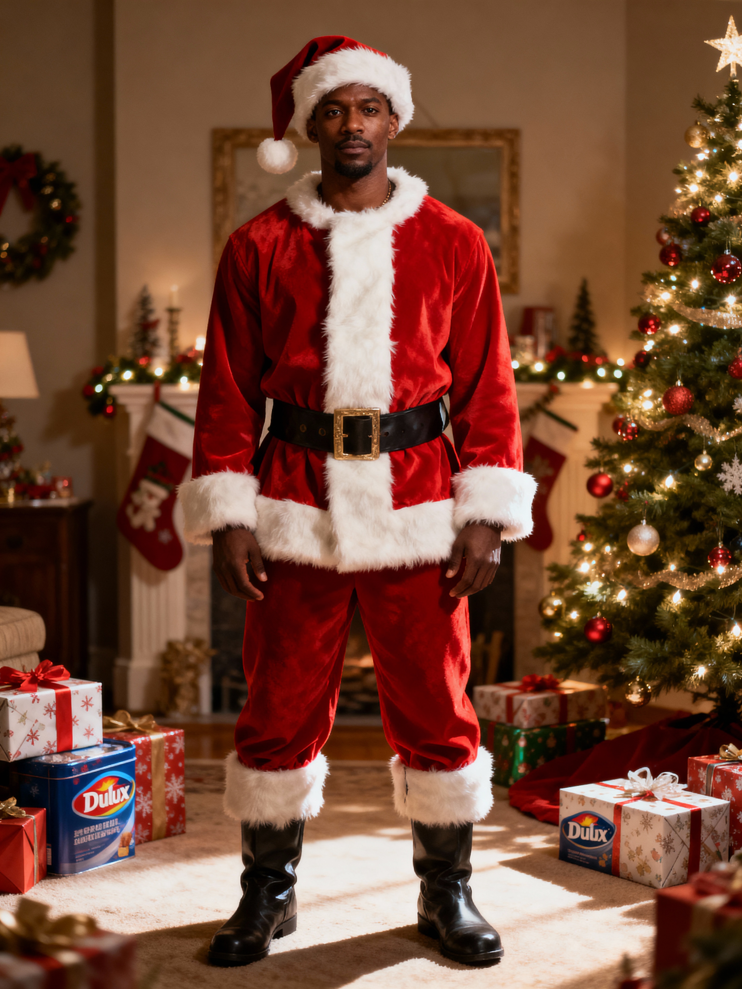 A model dressed in a classic Santa costume, standing in a room filled with holiday decorations, presents, and a Christmas tree.