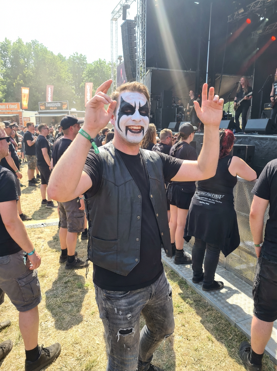 a model enjoying a live performance on a sunny day, with a bold face paint design, radiating the joy and excitement of the festival