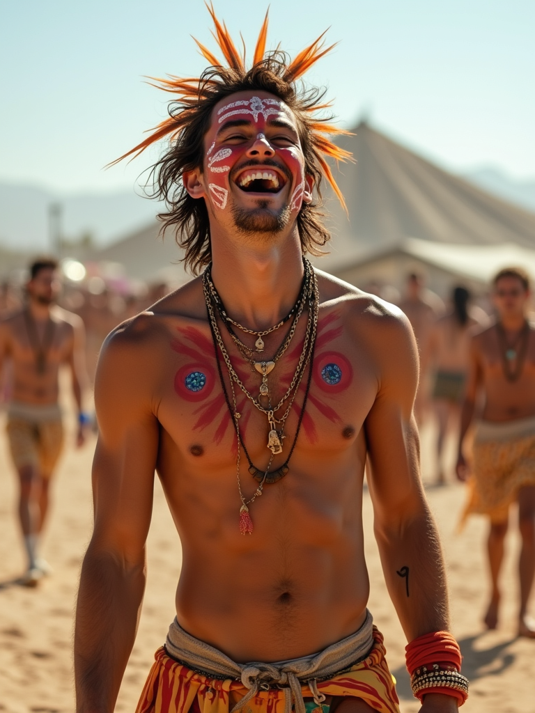 a model enjoying a performance at Coachella on a hot desert day, with a bold face paint design, radiating joy under the California sun