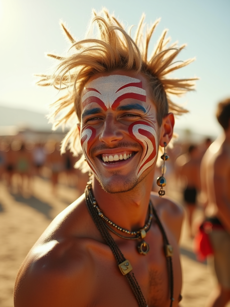 a model enjoying a performance at Coachella on a hot desert day, with a bold face paint design, radiating joy under the California sun