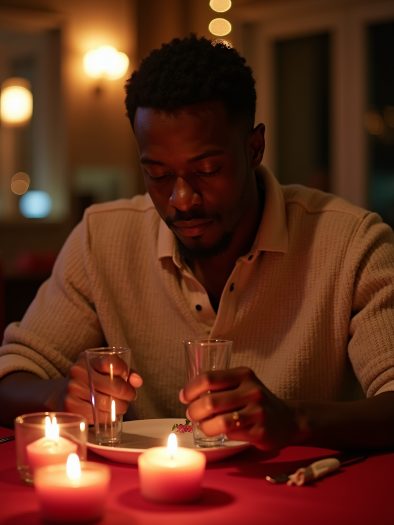 A model enjoying a romantic dinner with candles and soft lighting, set in a warm, Valentine's-themed atmosphere.