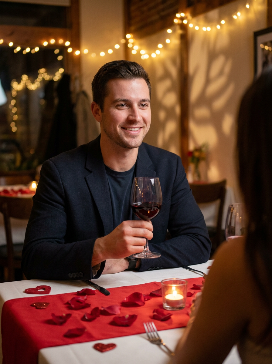 A model enjoying a romantic dinner with candles and soft lighting, set in a warm, Valentine's-themed atmosphere.