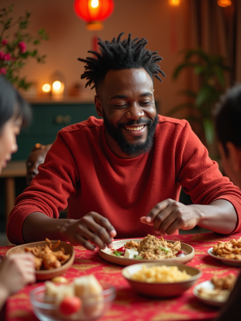a model enjoying Chinese New Year festivities, surrounded by friends playing traditional games, with a table full of symbolic foods and sweet treats