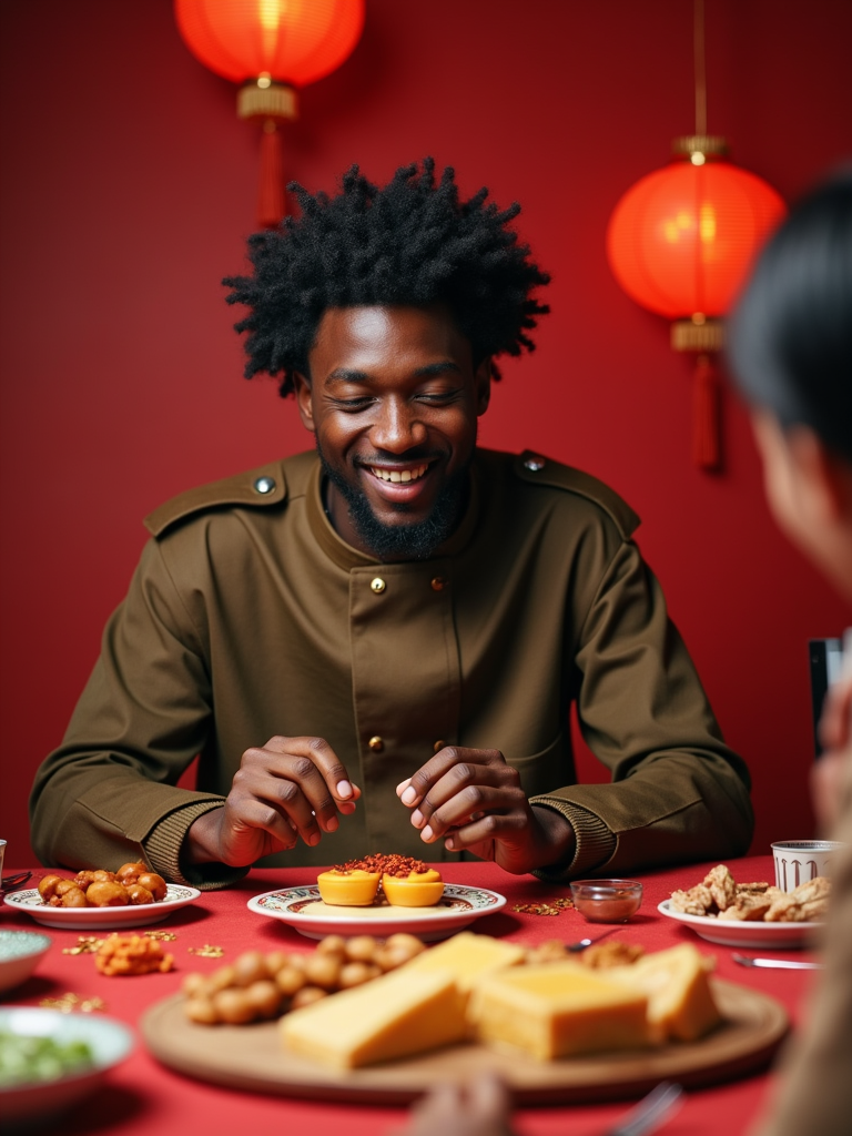 a model enjoying Chinese New Year festivities, surrounded by friends playing traditional games, with a table full of symbolic foods and sweet treats