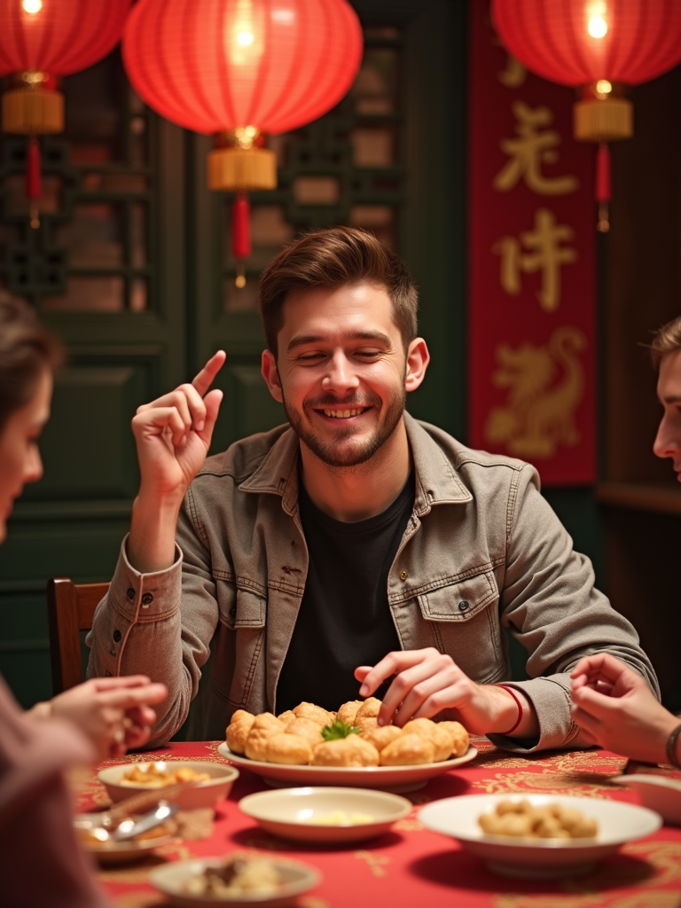 a model enjoying Chinese New Year festivities, surrounded by friends playing traditional games, with a table full of symbolic foods and sweet treats