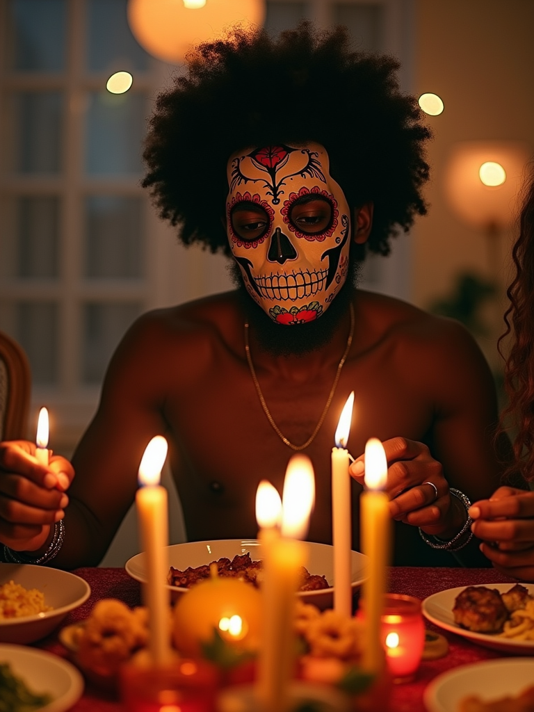 a model enjoying Day of the Dead festivities, surrounded by friends lighting candles at an altar, with a table full of traditional foods and favorite dishes of the departed
